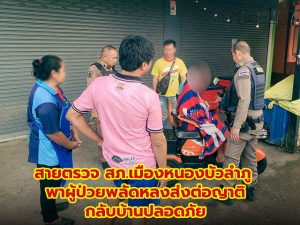 26 เมษายน 2569 เวลา 17.30 น. สภ.เมืองหนองบัวลำภู ได้รับแจ้งจากประชาชนว่าพบบุคคลมีลักษณะคล้ายพลัดหลง ขับขี่รถจักรยานไฟฟ้าวนเวียนอยู่บริเวณวัดสระแก้ว ต.โพธิ์ชัย อ.เมือง จ.หนองบัวลำภู จึงได้สั่งการให้เจ้าหน้าที่ร้อยเวร 2-0 พร้อมสายตรวจออกตรวจสอบโดยทันที